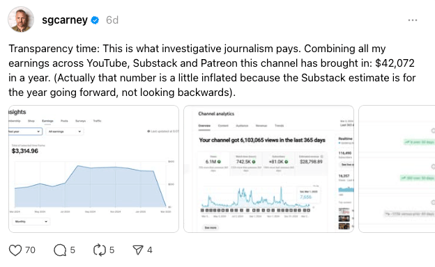 Independent investigative journalist Scott Carney shared his combined earnings across Substack, YouTube and Patreon for the last 12 months: