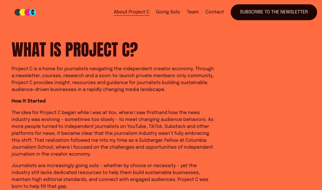 A Place to Grow: Over the past year, I’ve had so many conversations with journalists navigating the creator model about what’s working, what’s hard and what support is still missing. Now, there’s a place to bring those conversations together: projectc.biz. The site is a starting point — home to workshops, insights and (soon) resources for journalists building independent businesses. But more than that, it’s a reflection of this moment: one where more of us are shaping journalism on our own terms. If you check it out, I’d love to hear what you think. What’s useful? What’s missing? Hit reply! I’d love your input.