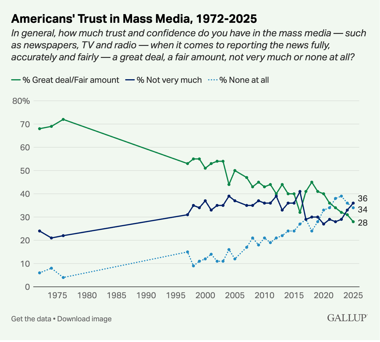 📌 Trust in mass media just hit rock bottom. Gallup finds only 28% of Americans now say they trust mass media — less than half the level of the 1970s, when it was 72%.