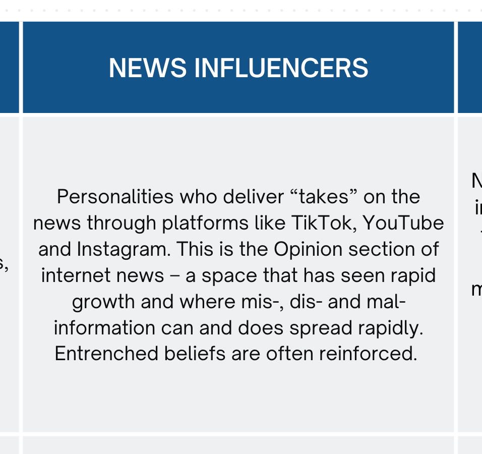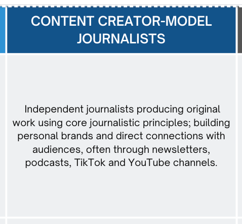 This infographic was designed to map the full news ecosystem, but its core purpose was to help situate content creator-model journalists and news influencers within it. That’s where we’ll focus here.