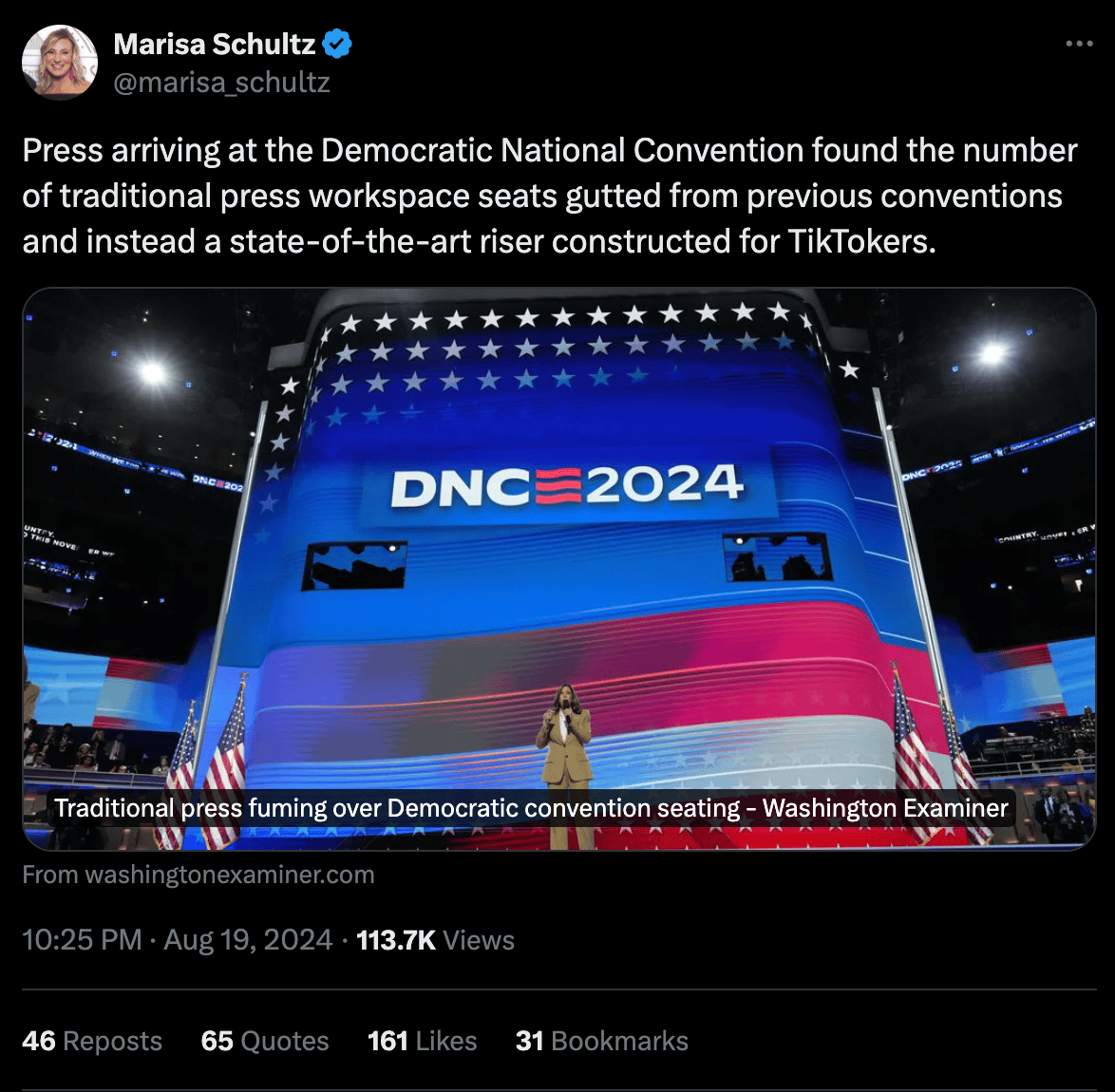 This is an important distinction because although it was fun to see Tina Leung rocking cute ‘fits around the convention center, the impetus behind their sudden inclusion in official events is not the First Amendment. It’s marketing. The RNC, DNC and White House courted influencers to vie for attention this summer and it worked. An increase in engagement with political content is net good, especially when it comes to getting out the vote. The risk, though, is that the audience will see what Tina, and others, post as credible news when what it really is is complementary and non-critical amplifications of the parties, or candidates, own agendas.