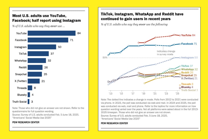📌 Pew Research, truly masters of the slow drip of juicy data points, is out with another drip: Earlier this month, they shared the latest stats about Americans’ rising reliance on social media for news and now they’re back to tell us that YouTube and Facebook are the platforms of choice for most Americans, though TikTok, Reddit and WhatsApp continue to gain ground with younger audiences.