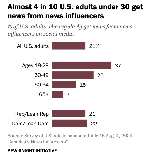 Young adults (18-29) are more likely to get news from influencers (37%) and find it helpful