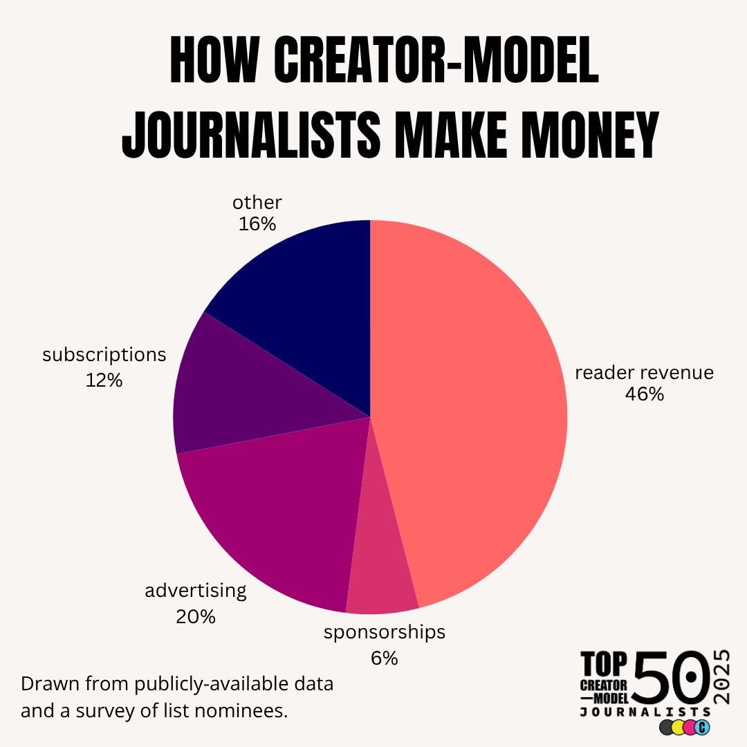 This growth in revenue streams has allowed once-solo creators to scale up. People like Matt Brown, who launched Extra Points, a newsletter about the business of college sports back in 2020. Today he has five employees and recently acquired another publication. Matt and others - Your Local Epidemiologist’s Kaitlyn Jetelina, YouTuber Johnny Harris, Platformer’s Casey Newton – may have started as one-person operations, but they’ve built what are, by any definition, media companies. Not the next Vox or Vice, but something truly new: audience-first, creator-led, and increasingly self-sustaining. Seven journalists on the Top 50 list report they’re making more than $500K a year.