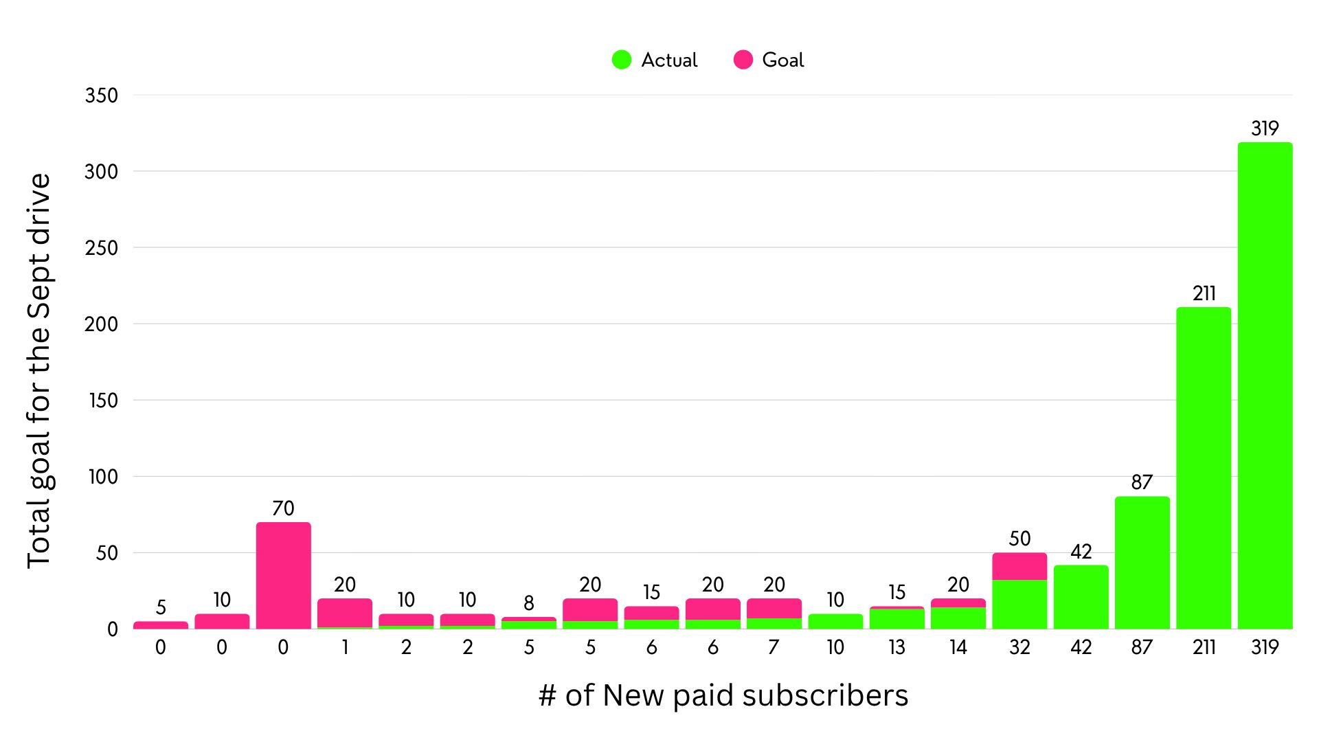 We did have a couple larger indie publishers participating in this drive so both their existing audience and their paid subscriber goals are higher than the median 15. But, for a ragtag bunch of solo journalists and a couple heavyweights, 762 new paid subscribers is pretty damn good for a one month drive.