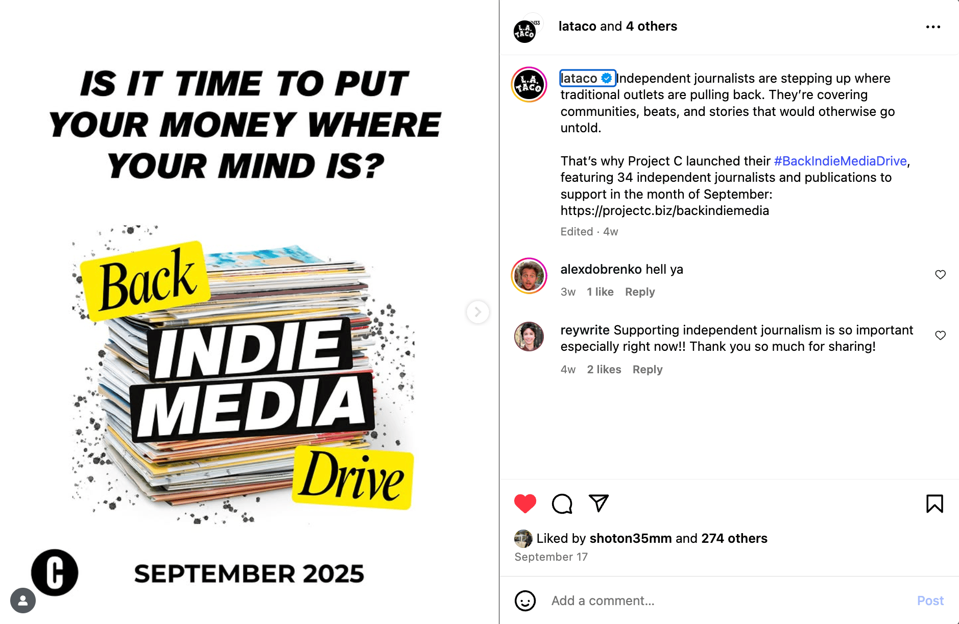 The Back Indie Media Drive on L.A. TACO’s Instagram