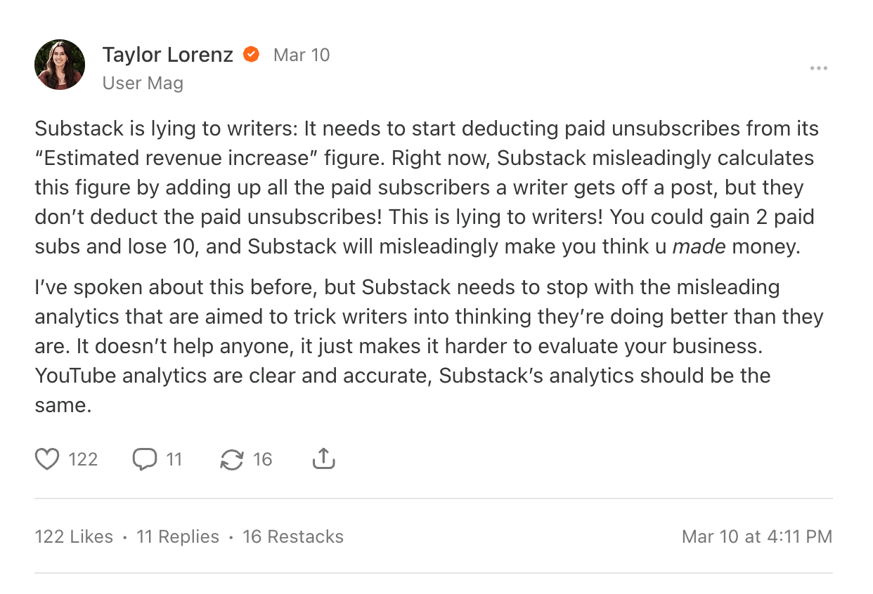 Substack doesn’t show creators the full churn data, which makes it easy to misread growth — and even overestimate revenue potential. Taylor Lorenz has called this out, too. What looks like steady growth might really be a leaky bucket.