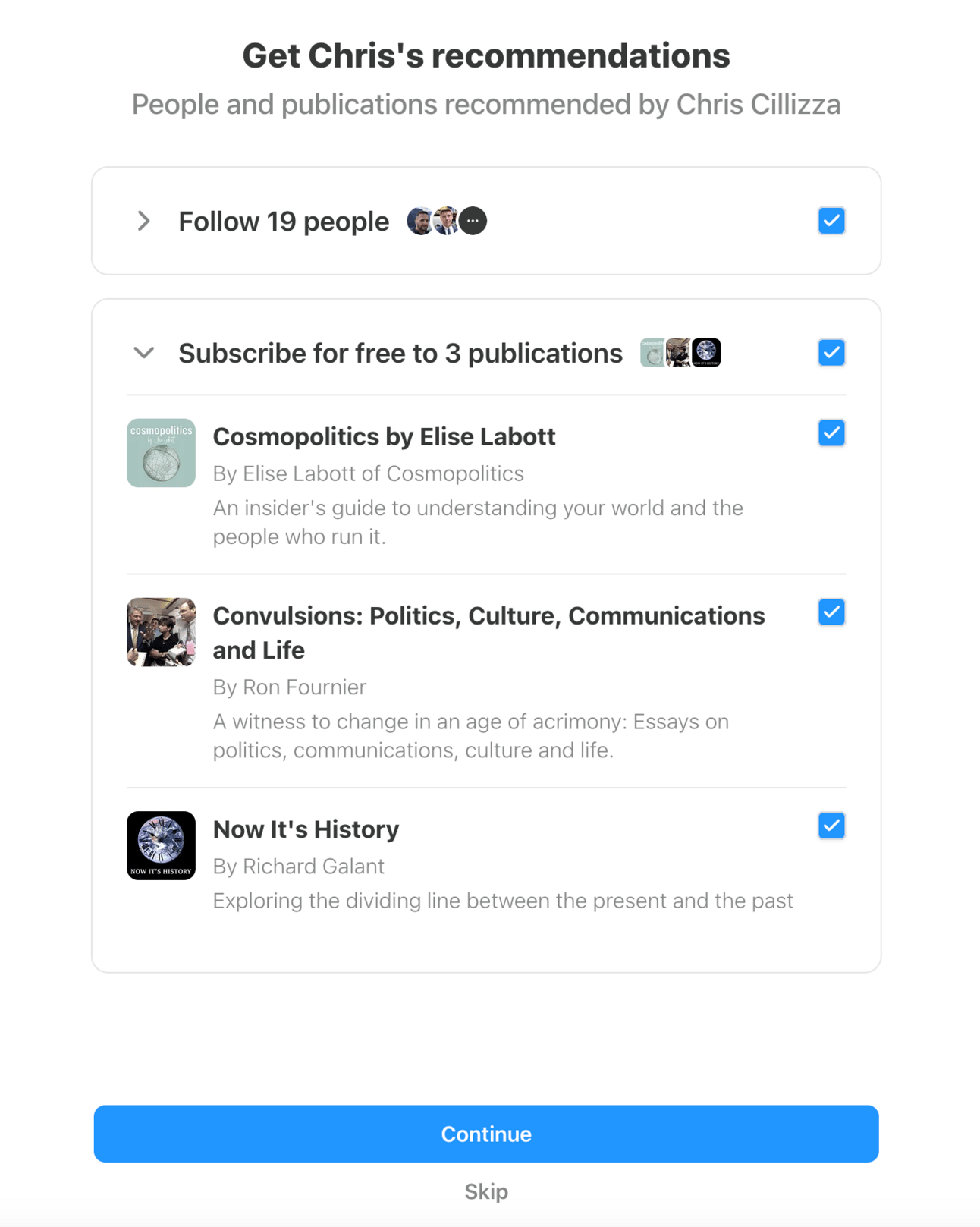 When someone subscribes to a newsletter like Chris Cillizza’s amazing So What in the example below, they’re automatically opted into several more via a recommendation screen. The boxes are pre-checked. The call to action is to “Continue.” The “Skip” button? Hard to spot.