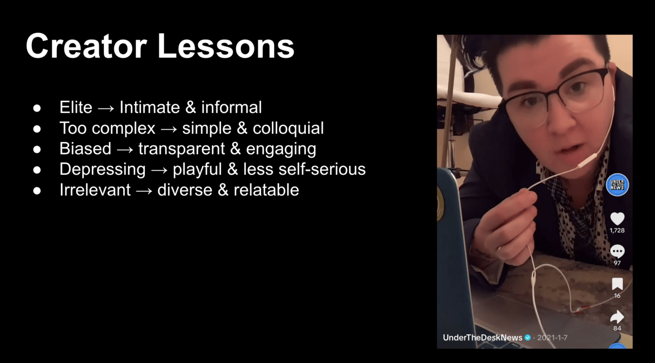 Reininga is also interested in how creators introduce transparency into their work in ways that are often much more visible than the rigorous work that goes into traditional journalism. Tools built into platforms like Tiktok – green screen ability to show and cite sources or dual-screen function – show process in a way that takes the audience along on their reporting and fact-checking journey. Reininga cited TikTok creator @expatriarch, who used his green screen to walk viewers through court documents and video to illustrate how he landed at his conclusions about the Blake Lively/Justin Baldoni lawsuit.
